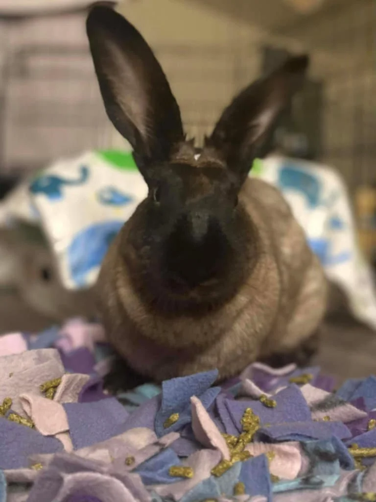 Cocoa is very sweet, energetic boy who loves to jump up and cuddle with you. He gets along great with cats too! He would love a home where he can have lots of free roam time but is a carpet nibbler so having dedicated rugs for his area would be ideal. He was born into the rescue and recently returned from a failed foster to adopt placement. He is now looking again for his fur-ever home. Black buns tend to get overlooked but this boy is wonderful and is just waiting for the right person to give him a chance.