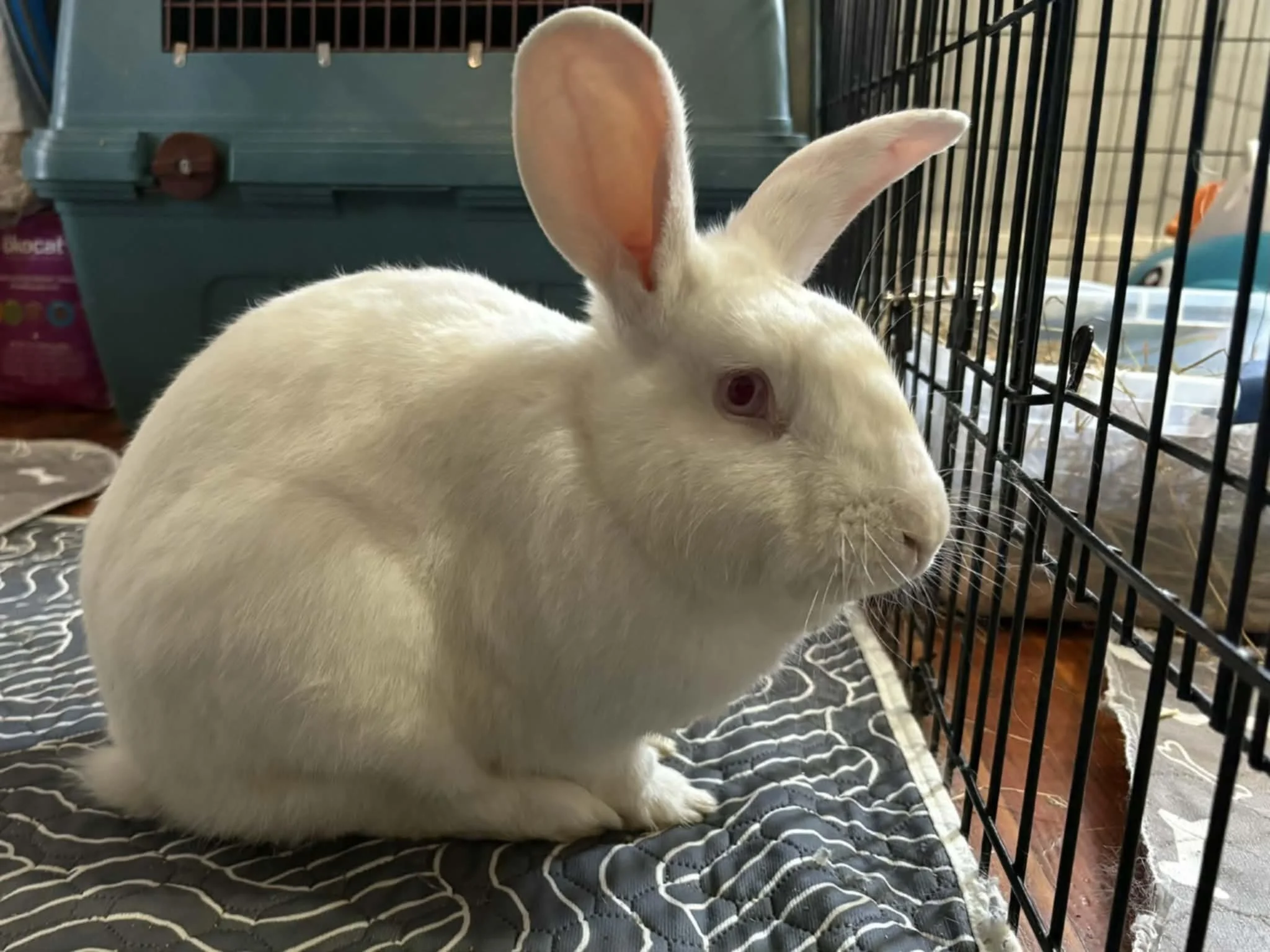 We are so happy he is safe and warm and are getting to know his personality as he settles. So far he seems like a sweet laid back bun but is still working on trusting us. He will have his vetting completed soon.